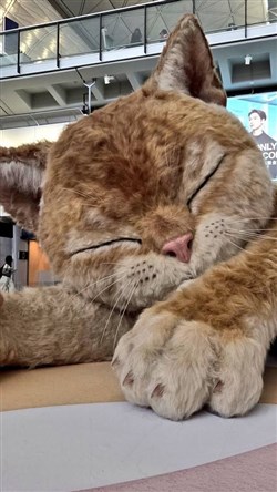 Situato nell’area Arrivi del Terminal 1, questo gigantesco felino arancione — alto circa otto metri — si muove, reagisce e “comunica” in modo sorprendente. Le sue espressioni, le fusa e i movimenti realistici danno l’impressione di trovarsi davanti a un animale vero, anche se si tratta di una creazione digitale.
